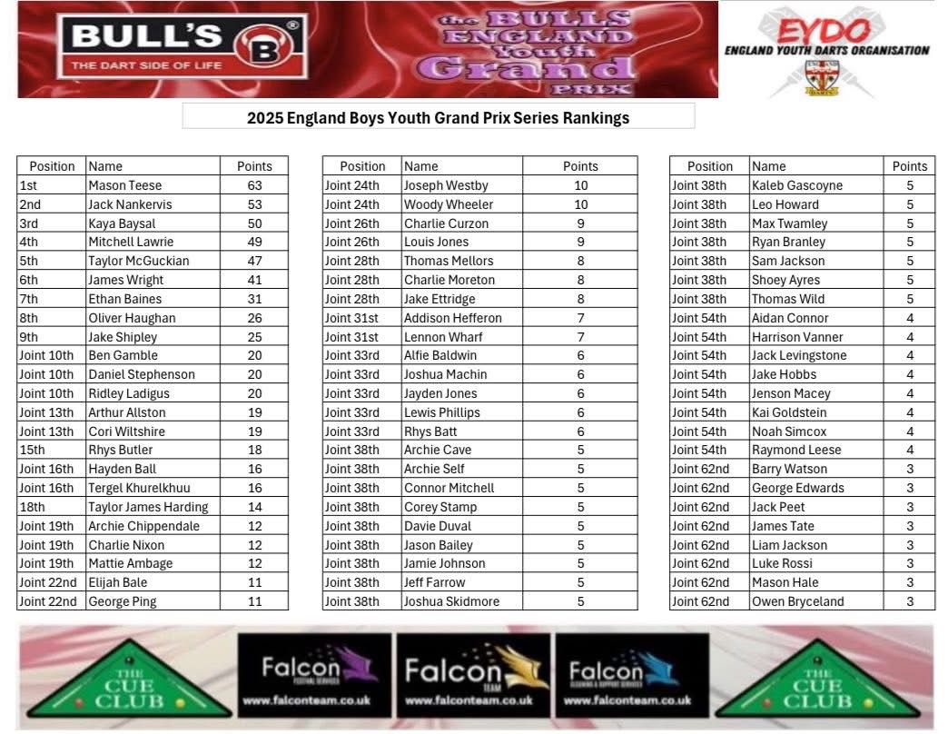 Our sincere thanks to the main sponsor Montagu Properties Services and the many donations from dart players and supporters, without which, the events would not be possible, once again a massive well done to our superb England Youth officials.